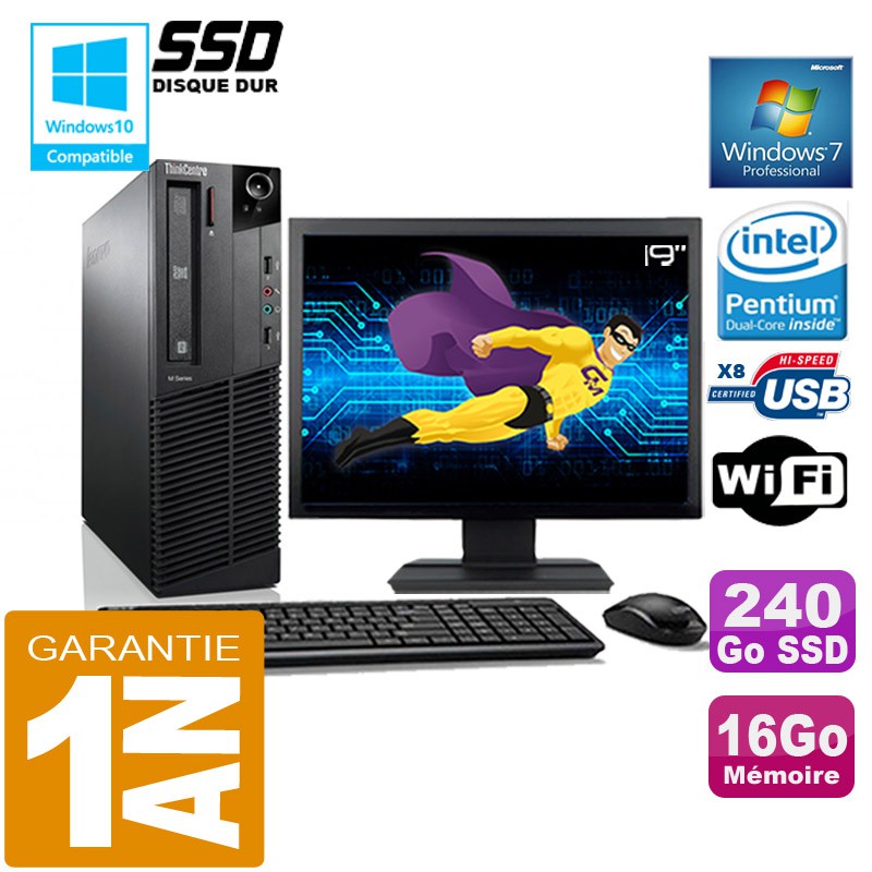 PC Lenovo M92p SFF -Intel Pentium G630 2,7Ghz (3 Mo de cache) - 16Go DDR3 - Disque Dur 240 Go SSD - Graveur DVD - Clé WIFI USB - Windows 7 Pro - Pack Clavier + Souris + Ecran 19" ( Marque et modèle selon arrivages) - Garantie = 1 an.