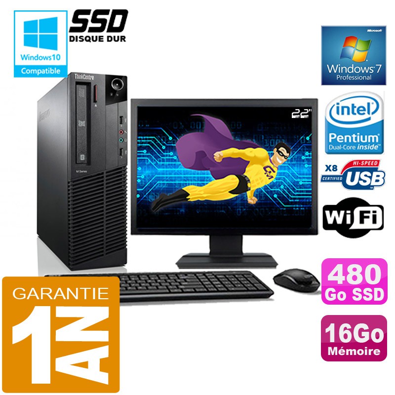 PC Lenovo M92p SFF -Intel Pentium G630 2,7Ghz (3 Mo de cache) - 16Go DDR3 - Disque Dur 480 Go SSD - Graveur DVD - Clé WIFI USB - Windows 7 Pro - Pack Clavier + Souris + Ecran 22" ( Marque et modèle selon arrivages) - Garantie = 1 an.