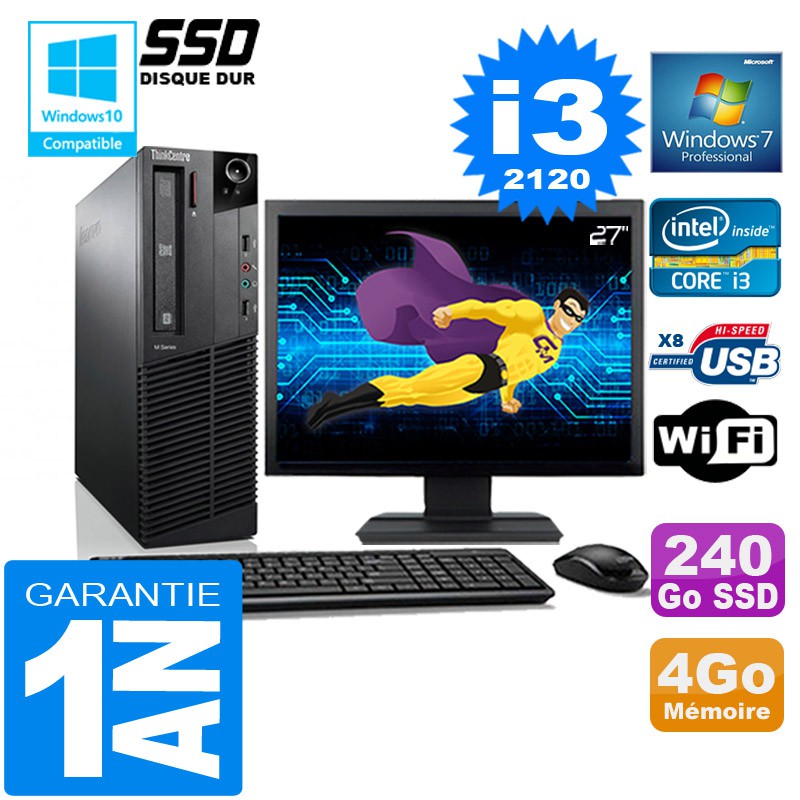 PC Lenovo M92p SFF Core I3-2120 Ram 4Go Disque 240 Go SSD Wifi W7 Ecran 27"