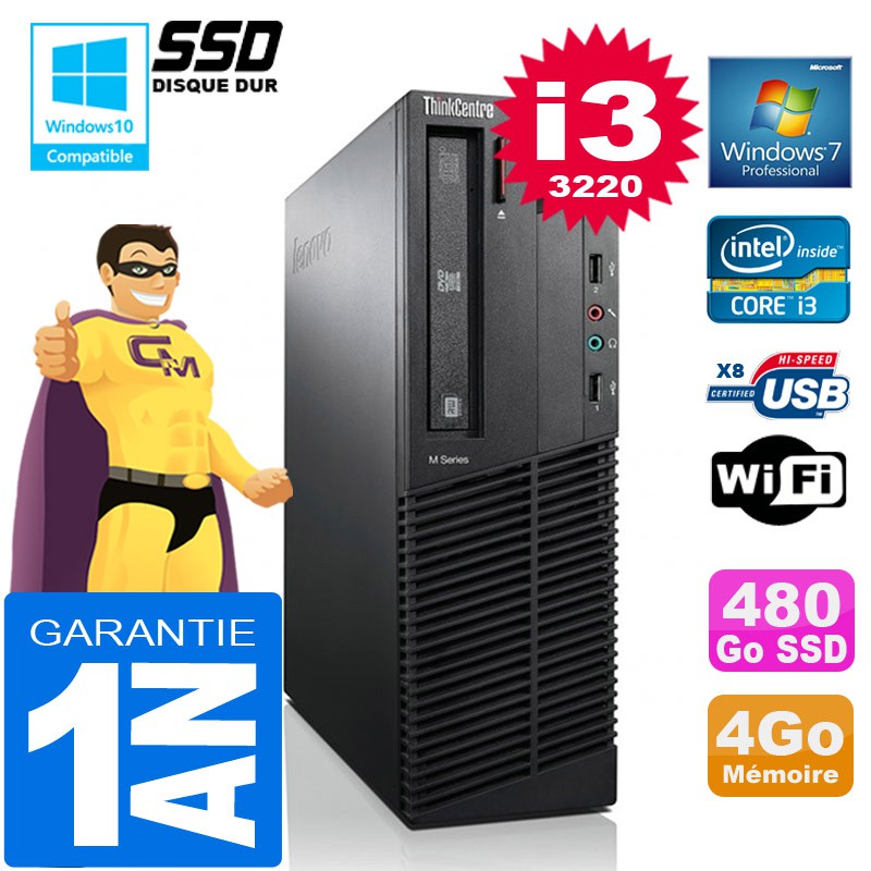 PC Lenovo M92p SFF Core I3-3220 Ram 4Go Disque 480 Go SSD Graveur DVD Wifi W7