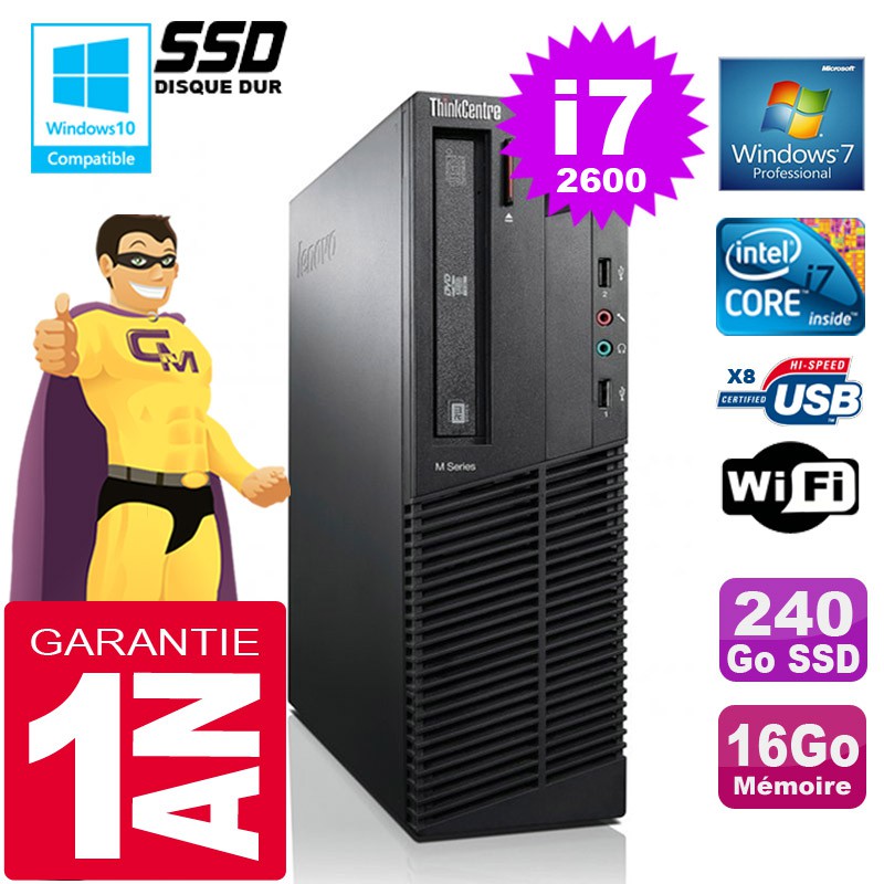 PC Lenovo M92p SFF - Intel Core I7-2600 3.4Ghz (8 Mo de cache) - 16 Go DDR3 - Disque Dur 240 Go SSD - Graveur DVD - Clé WIFI USB - Windows 7 Pro - Garantie = 1 an.
