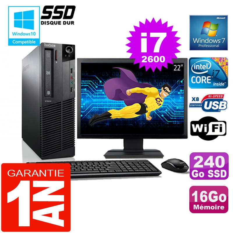 PC Lenovo M92p SFF Core I7-2600 Ram 16Go Disque 240 Go SSD Wifi W7 Ecran 22"