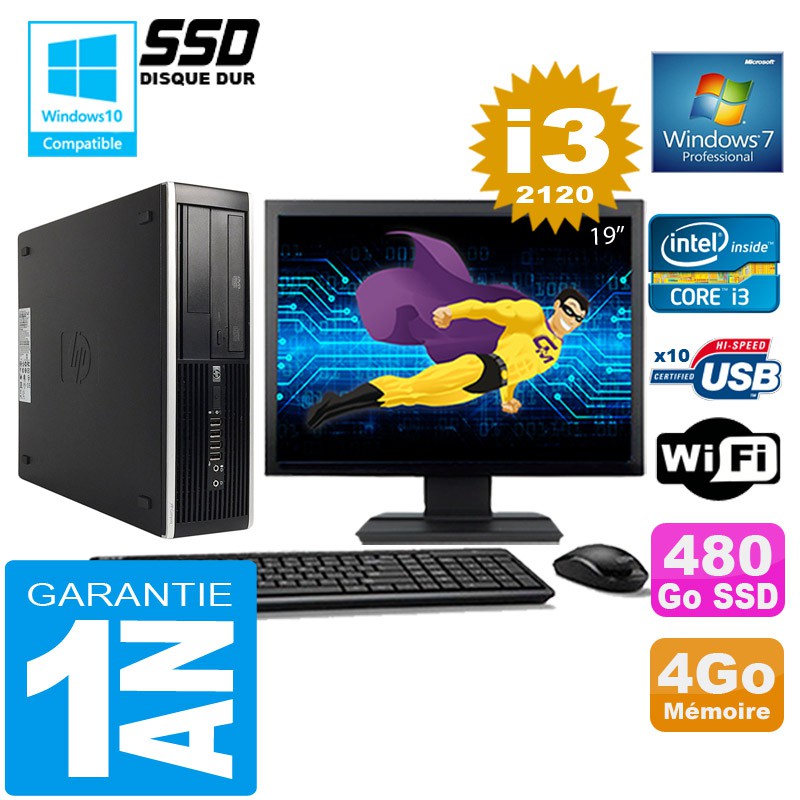 PC HP Compaq 8300 SFF Core I3-2120 Ram 4Go Disque 480 Go SSD Wifi W7 Ecran 19"