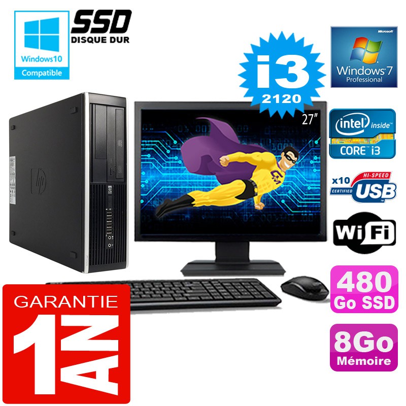 PC HP Compaq Elite 8300 SFF - Intel® Core I3-2120 3,3Ghz - (3 Mo de cache) - 8 Go DDR3 - Disque Dur 480 Go SSD - Graveur DVD - Clé WIFI USB - Windows 7 Pro - Pack Clavier + Souris + Ecran 27" ( Marque et modèle selon arrivages) - Garantie = 1 an.