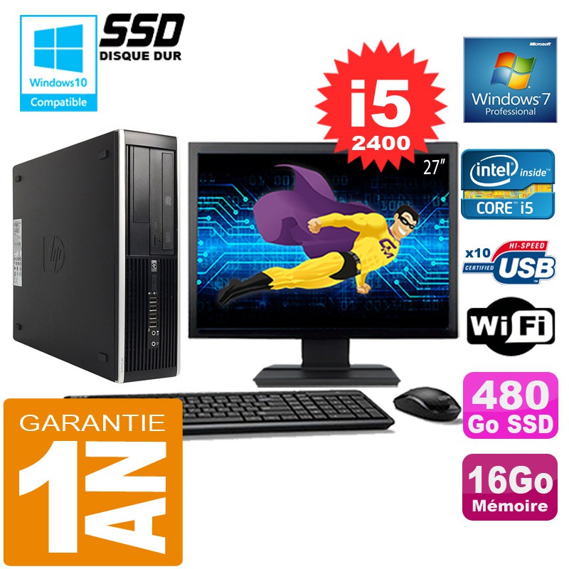 PC HP Compaq 8300 SFF Core I5-2400 Ram 16Go Disque 480 Go SSD Wifi W7 Ecran 27"
