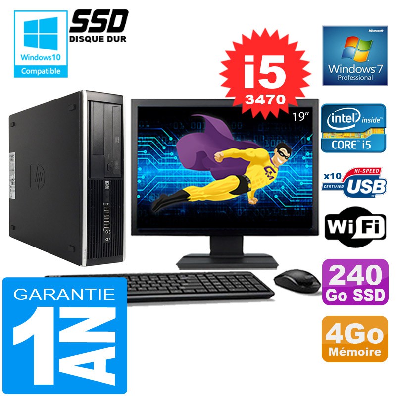 PC HP Compaq 8300 SFF Core I5-3470 Ram 4Go Disque 240 Go SSD Wifi W7 Ecran 19"