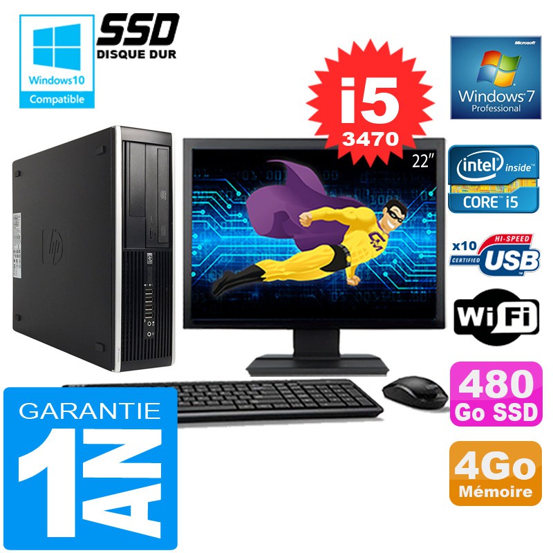 PC HP Compaq 8300 SFF Core I5-3470 Ram 4Go Disque 480 Go SSD Wifi W7 Ecran 22"