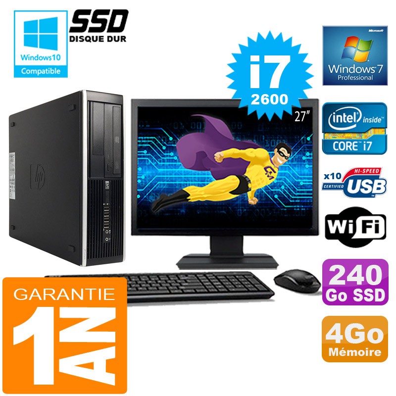 PC HP Compaq 8300 SFF Core I7-2600 Ram 4Go Disque 240 Go SSD Wifi W7 Ecran 27"