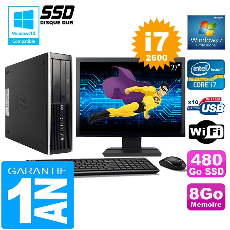 PC HP Compaq 8300 SFF Core I7-2600 Ram 8Go Disque 480 Go SSD Wifi W7 Ecran 27"