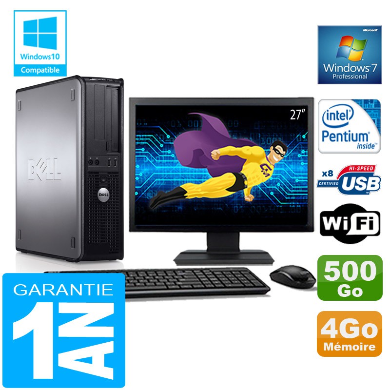 PC DELL 780 DT - Intel® Pentium® Dual Core E5300 2,60Ghz (2 Mo de cache) - 4 Go DDR3 - Disque Dur 500 Go - Graveur DVD - Clé WIFI USB - Windows 7 Pro - Pack Clavier + Souris + Ecran 27" ( Marque et modèle selon arrivages) - Garantie = 1 an.
