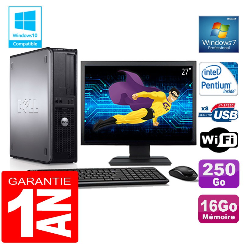 PC DELL 780 DT - Intel® Pentium® Dual Core E5300 2,60Ghz (2 Mo de cache) - 16 Go DDR3 - Disque Dur 250 Go - Graveur DVD - Clé WIFI USB - Windows 7 Pro - Pack Clavier + Souris + Ecran 27" ( Marque et modèle selon arrivages) - Garantie = 1 an.