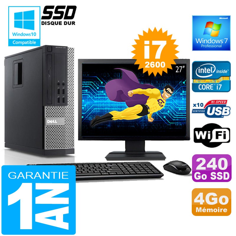 PC DELL 990 SFF Core I7-2600 Ram 4Go Disque 240 Go SSD Wifi W7 Ecran 27"