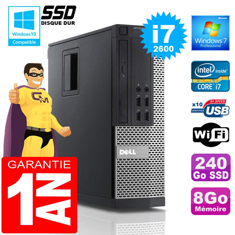 PC DELL 990 SFF - Intel® Core I7-2600 3,4Ghz (8 Mo de cache) - 8 Go DDR3 - Disque Dur 240 Go SSD - Graveur DVD - Clé WIFI USB - Windows 7 Pro - Garantie = 1 an.