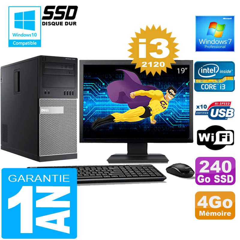 PC Tour DELL 7010 MT - Intel® Core I3-2120 3,3Ghz (3 Mo de cache) - 4 Go DDR3 - Disque Dur 240 Go SSD - Graveur DVD - Clé WIFI USB - Windows 7 Pro - Pack Clavier + Souris + Ecran 19" ( Marque et modèle selon arrivages) - Garantie = 1 an.