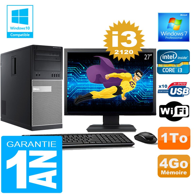 PC Tour DELL 7010 MT - Intel® Core I3-2120 3,3Ghz (3 Mo de cache) - 4 Go DDR3 - Disque Dur 1To - Graveur DVD - Clé WIFI USB - Windows 7 Pro - Pack Clavier + Souris + Ecran 27" ( Marque et modèle selon arrivages) - Garantie = 1 an.