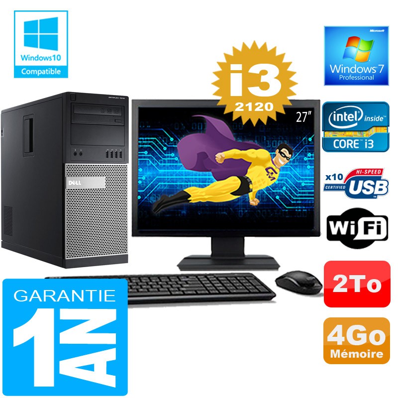 PC Tour DELL 7010 MT - Intel® Core I3-2120 3,3Ghz (3 Mo de cache) - 4 Go DDR3 - Disque Dur 2To - Graveur DVD - Clé WIFI USB - Windows 7 Pro - Pack Clavier + Souris + Ecran 27" ( Marque et modèle selon arrivages) - Garantie = 1 an.