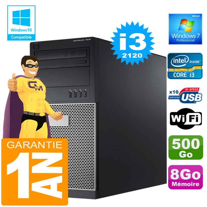 PC Tour DELL 7010 MT - Intel® Core I3-2120 3,3Ghz (3 Mo de cache) - 8 Go DDR3 - Disque Dur 500Go - Graveur DVD - Clé WIFI USB - Windows 7 Pro - Garantie = 1 an.
