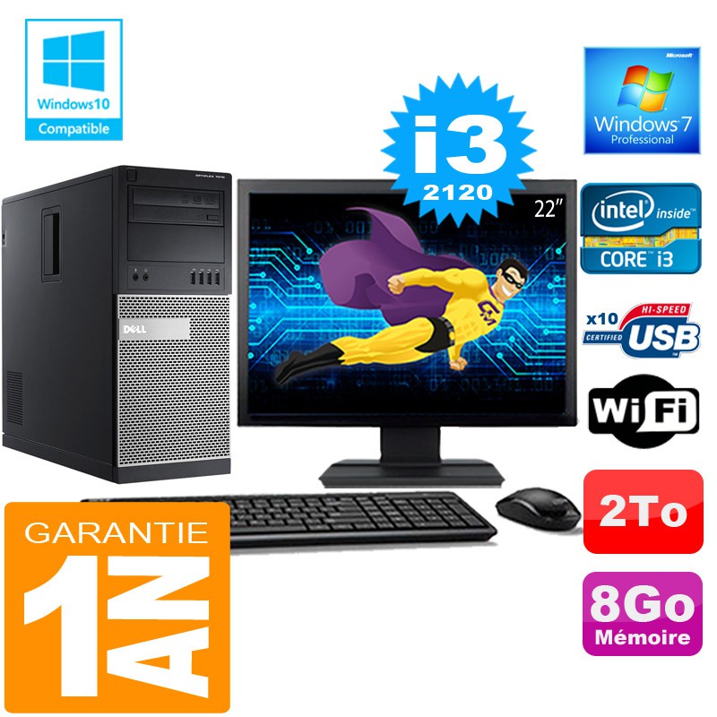 PC Tour DELL 7010 Core I3-2120 Ram 8Go Disque 2 To Wifi W7 Ecran 22"
