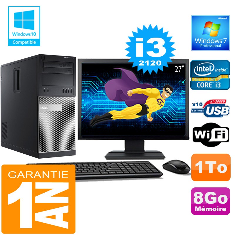 PC Tour DELL 7010 MT - Intel® Core I3-2120 3,3Ghz (3 Mo de cache) - 8 Go DDR3 - Disque Dur 1To - Graveur DVD - Clé WIFI USB - Windows 7 Pro - Pack Clavier + Souris + Ecran 27" ( Marque et modèle selon arrivages) - Garantie = 1 an.