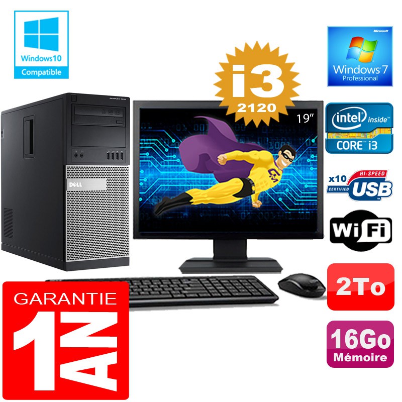PC Tour DELL 7010 MT - Intel® Core I3-2120 3,3Ghz (3 Mo de cache) - 16 Go DDR3 - Disque Dur 2To - Graveur DVD - Clé WIFI USB - Windows 7 Pro - Pack Clavier + Souris + Ecran 19" ( Marque et modèle selon arrivages) - Garantie = 1 an.
