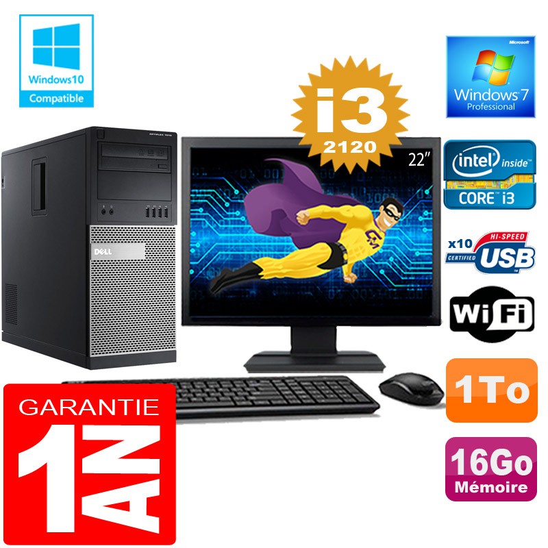 PC Tour DELL 7010 MT - Intel® Core I3-2120 3,3Ghz (3 Mo de cache) - 16 Go DDR3 - Disque Dur 1To - Graveur DVD - Clé WIFI USB - Windows 7 Pro - Pack Clavier + Souris + Ecran 22" ( Marque et modèle selon arrivages) - Garantie = 1 an.