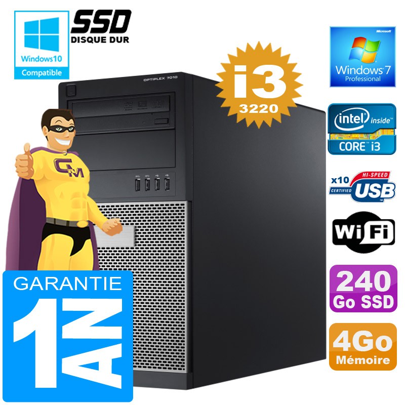 PC Tour DELL 7010 MT - Intel® Core I3-3220 3.3Ghz (3 Mo de cache) - 4 Go DDR3 - Disque Dur 240 Go SSD - Graveur DVD - Clé WIFI USB - Windows 7 Pro - Garantie = 1 an.