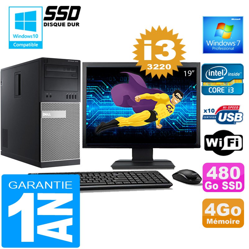 PC Tour DELL 7010 MT - Intel® Core I3-3220 3.3Ghz (3 Mo de cache) - 4 Go DDR3 - Disque Dur 480Go SSD - Graveur DVD - Clé WIFI USB - Windows 7 Pro - Pack Clavier + Souris + Ecran 19" ( Marque et modèle selon arrivages) - Garantie = 1 an.