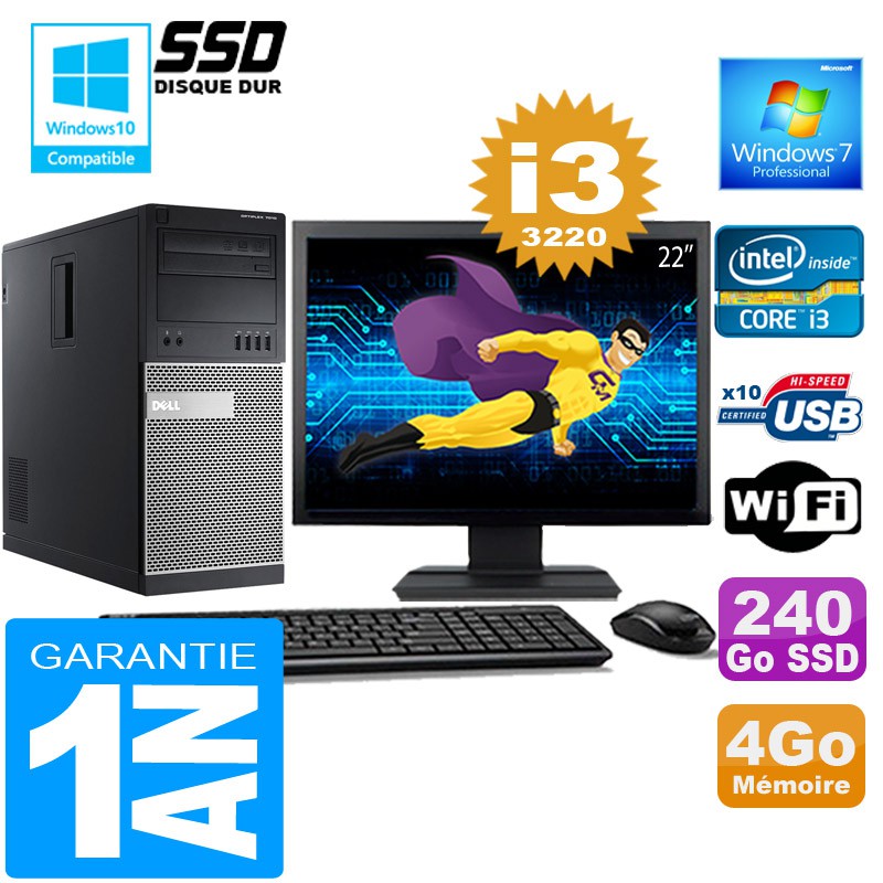 PC Tour DELL 7010 MT - Intel® Core I3-3220 3.3Ghz (3 Mo de cache) - 4 Go DDR3 - Disque Dur 240 Go SSD - Graveur DVD - Clé WIFI USB - Windows 7 Pro - Pack Clavier + Souris + Ecran 22" ( Marque et modèle selon arrivages) - Garantie = 1 an.