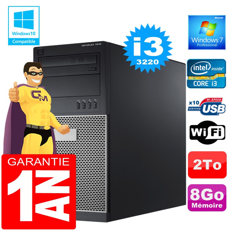 PC Tour DELL 7010 MT - Intel® Core I3-3220 3.3Ghz (3 Mo de cache) - 8 Go DDR3 - Disque Dur 2 To - Graveur DVD - Clé WIFI USB - Windows 7 Pro - Garantie = 1 an.