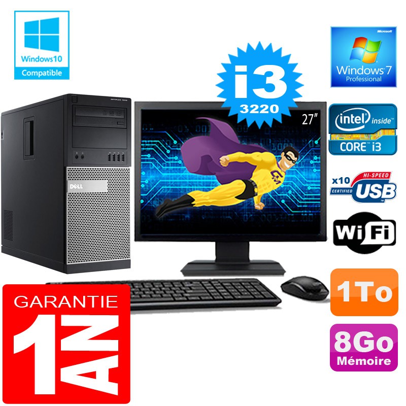 PC Tour DELL 7010 Core I3-3220 Ram 8Go Disque 1 To Wifi W7 Ecran 27"