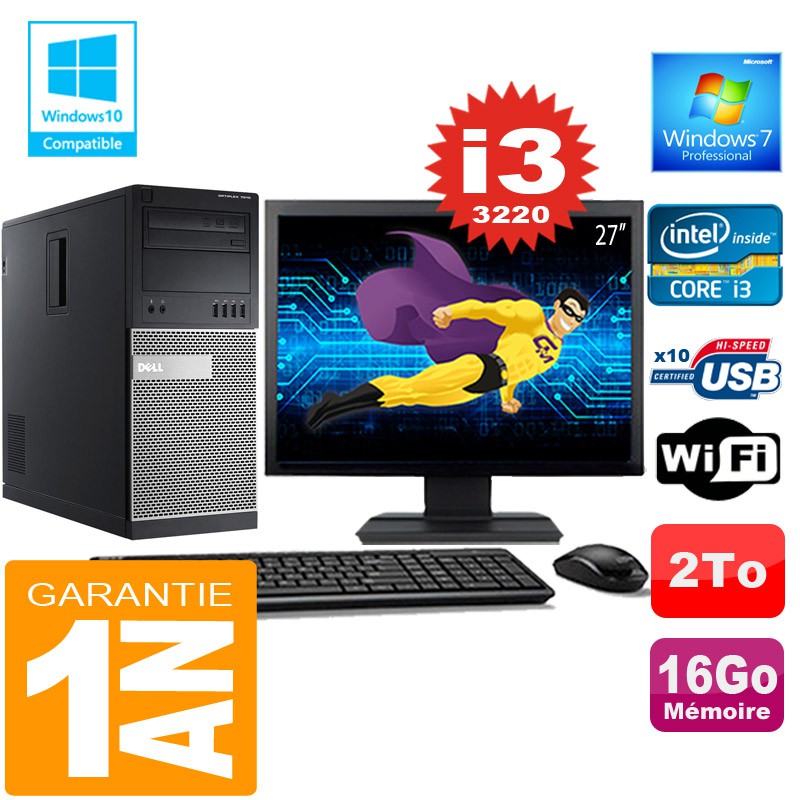 PC Tour DELL 7010 Core I3-3220 Ram 16Go Disque 2 To Wifi W7 Ecran 27"
