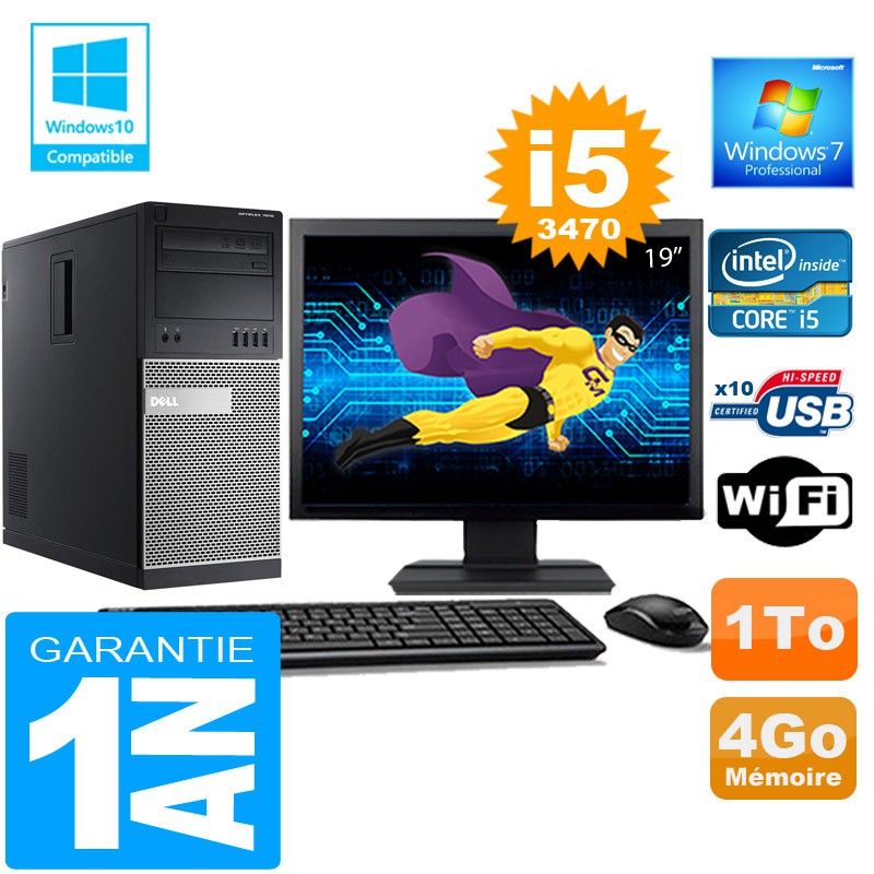 PC Tour DELL 7010 MT - Intel® Core I5-3470 3.2Ghz (6 Mo de cache) - 4 Go DDR3 - Disque Dur 1To - Graveur DVD - Clé WIFI USB - Windows 7 Pro - Pack Clavier + Souris + Ecran 19" ( Marque et modèle selon arrivages) - Garantie = 1 an.