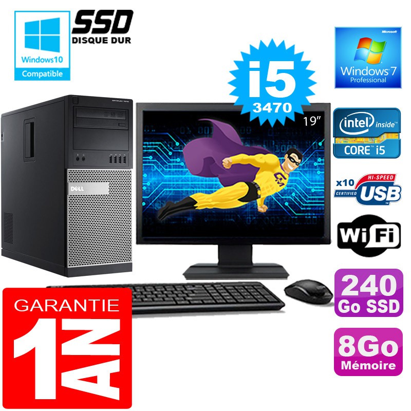 PC Tour DELL 7010 MT - Intel® Core I5-3470 3.2Ghz (6 Mo de cache) - 8 Go DDR3 - Disque Dur 240 Go SSD - Graveur DVD - Clé WIFI USB - Windows 7 Pro - Pack Clavier + Souris + Ecran 19" ( Marque et modèle selon arrivages) - Garantie = 1 an.
