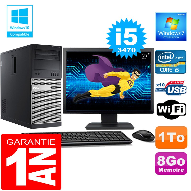 PC Tour DELL 7010 MT - Intel® Core I5-3470 3.2Ghz (6 Mo de cache) - 8 Go DDR3 - Disque Dur 1To - Graveur DVD - Clé WIFI USB - Windows 7 Pro - Pack Clavier + Souris + Ecran 27" ( Marque et modèle selon arrivages) - Garantie = 1 an.