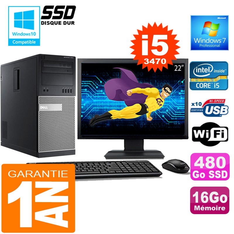 PC Tour DELL 7010 MT - Intel® Core I5-3470 3.2Ghz (6 Mo de cache) -16Go DDR3 - Disque Dur 480 Go SSD - Graveur DVD - Clé WIFI USB - Windows 7 Pro - Pack Clavier + Souris + Ecran 22" ( Marque et modèle selon arrivages) - Garantie = 1 an.