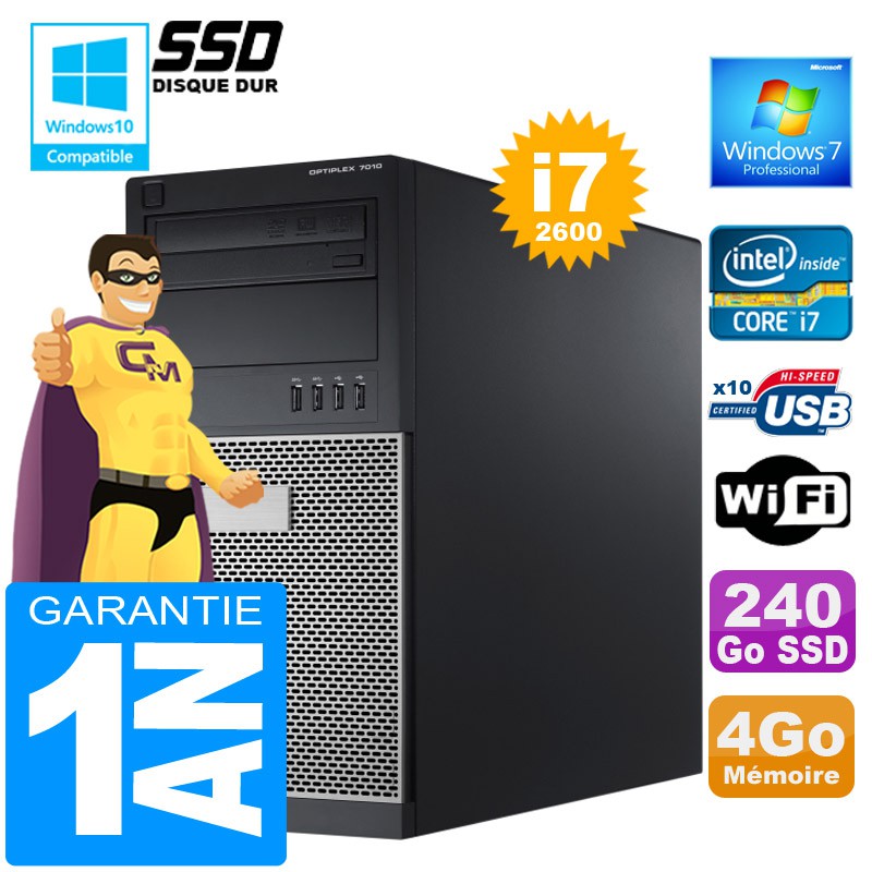 PC Tour DELL 7010 MT - Intel® Core I7-2600 3,4Ghz (8 Mo de cache) - 4Go DDR3 - Disque Dur 240 Go SSD - Graveur DVD - Clé WIFI USB - Windows 7 Pro - Garantie = 1 an.