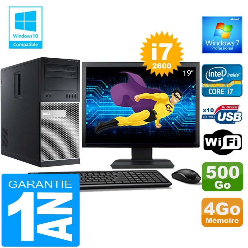 PC Tour DELL 7010 MT - Intel® Core I7-2600 3,4Ghz (8 Mo de cache) - 4Go DDR3 - Disque Dur 500 Go - Graveur DVD - Clé WIFI USB - Windows 7 Pro - Pack Clavier + Souris + Ecran 19" ( Marque et modèle selon arrivages) - Garantie = 1 an.