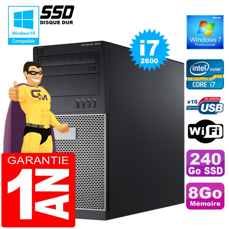 PC Tour DELL 7010 MT - Intel® Core I7-2600 3,4Ghz (8 Mo de cache) - 8Go DDR3 - Disque Dur 240 Go SSD - Graveur DVD - Clé WIFI USB - Windows 7 Pro - Garantie = 1 an.