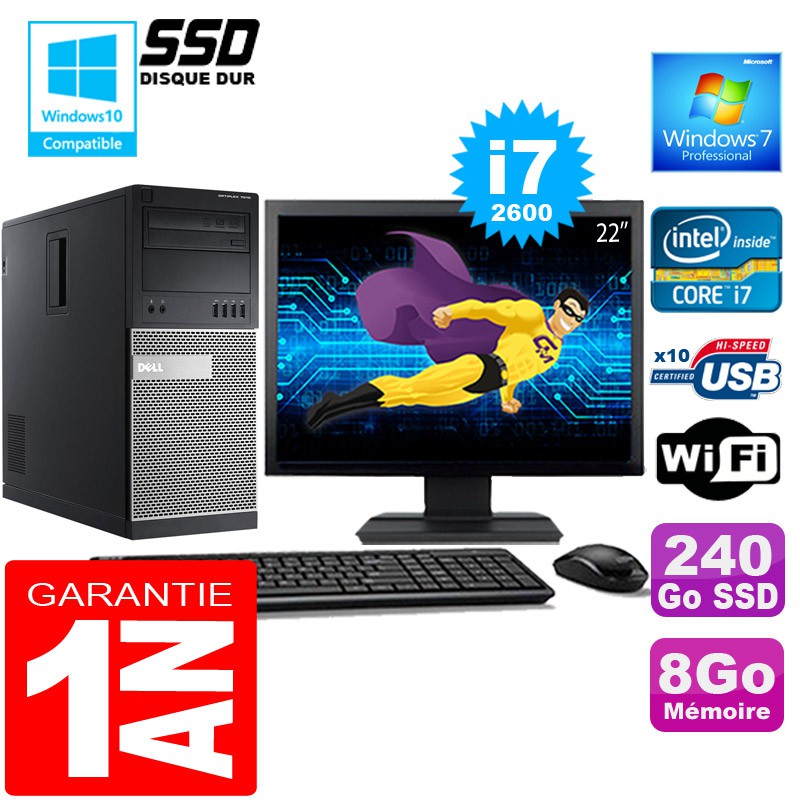 PC Tour DELL 7010 MT - Intel® Core I7-2600 3,4Ghz (8 Mo de cache) - 8Go DDR3 - Disque Dur 240 Go SSD - Graveur DVD - Clé WIFI USB - Windows 7 Pro - Pack Clavier + Souris + Ecran 22" ( Marque et modèle selon arrivages) - Garantie = 1 an.