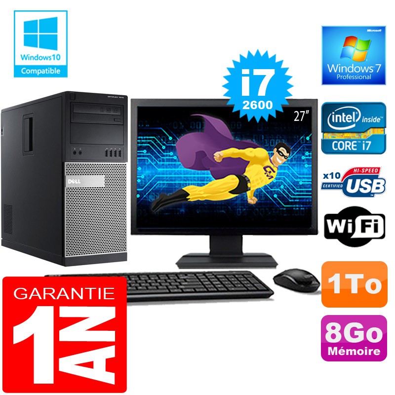 PC Tour DELL 7010 MT - Intel® Core I7-2600 3,4Ghz (8 Mo de cache) - 8Go DDR3 - Disque Dur 1To - Graveur DVD - Clé WIFI USB - Windows 7 Pro - Pack Clavier + Souris + Ecran 27" ( Marque et modèle selon arrivages) - Garantie = 1 an.