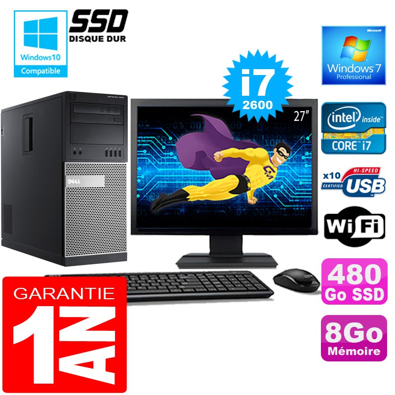 PC Tour DELL 7010 MT - Intel® Core I7-2600 3,4Ghz (8 Mo de cache) - 8Go DDR3 - Disque Dur 480 Go SSD - Graveur DVD - Clé WIFI USB - Windows 7 Pro - Pack Clavier + Souris + Ecran 27" ( Marque et modèle selon arrivages) - Garantie = 1 an.