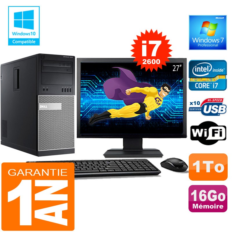 PC Tour DELL 7010 Core I7-2600 Ram 16Go Disque 1 To Wifi W7 Ecran 27"