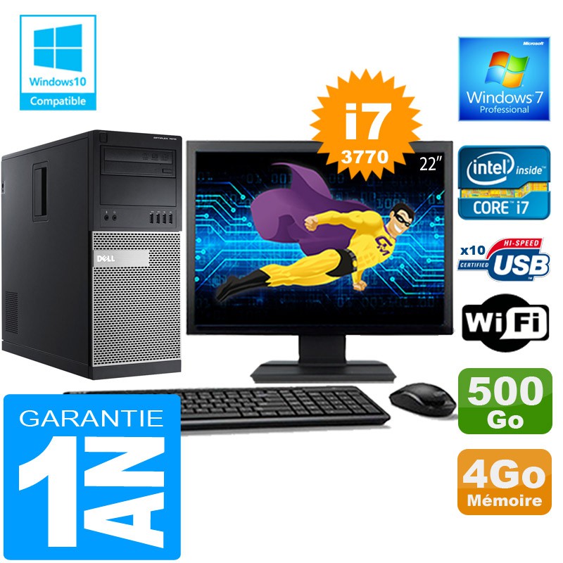 PC Tour DELL 7010 MT - Intel® Core I7-3770 3,4Ghz (8 Mo de cache) - 4Go DDR3 - Disque Dur 500 Go - Graveur DVD - Clé WIFI USB - Windows 7 Pro - Pack Clavier + Souris + Ecran 22" ( Marque et modèle selon arrivages) - Garantie = 1 an.