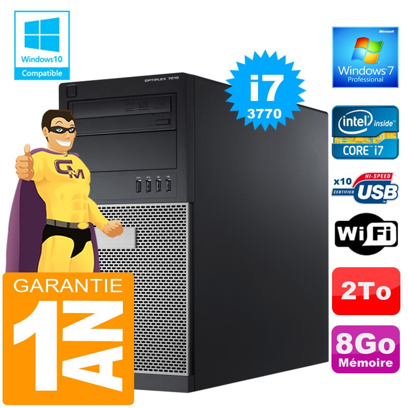 PC Tour DELL 7010 MT - Intel® Core I7-3770 3,4Ghz (8 Mo de cache) - 8Go DDR3 - Disque Dur 2 To - Graveur DVD - Clé WIFI USB - Windows 7 Pro - Garantie = 1 an.