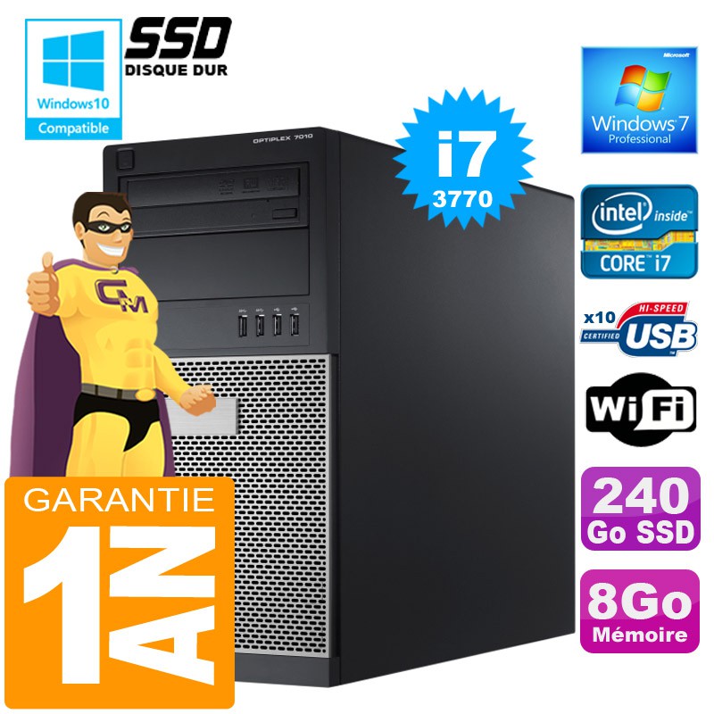 PC Tour DELL 7010 MT - Intel® Core I7-3770 3,4Ghz (8 Mo de cache) - 8Go DDR3 - Disque Dur 240 Go SSD - Graveur DVD - Clé WIFI USB - Windows 7 Pro - Garantie = 1 an.