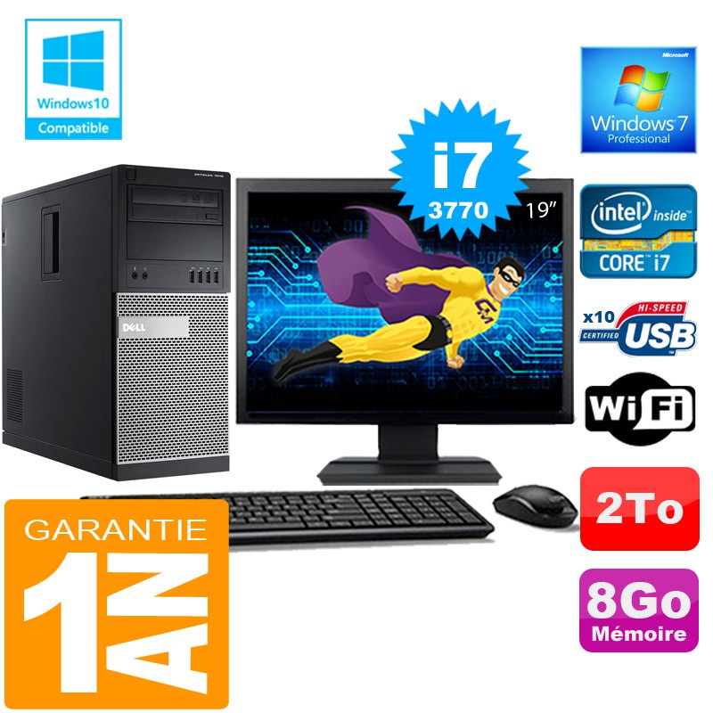 PC Tour DELL 7010 MT - Intel® Core I7-3770 3,4Ghz (8 Mo de cache) - 8Go DDR3 - Disque Dur 2To - Graveur DVD - Clé WIFI USB - Windows 7 Pro - Pack Clavier + Souris + Ecran 19" ( Marque et modèle selon arrivages) - Garantie = 1 an.