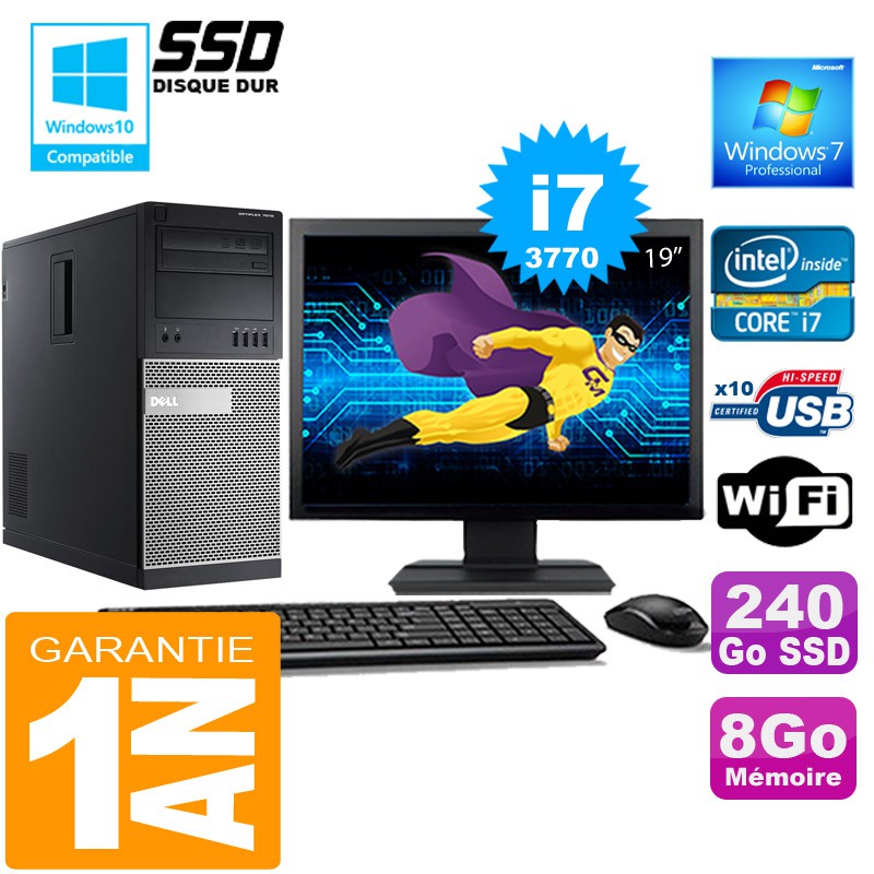 PC Tour DELL 7010 MT - Intel® Core I7-3770 3,4Ghz (8 Mo de cache) - 8Go DDR3 - Disque Dur 240 Go SSD - Graveur DVD - Clé WIFI USB - Windows 7 Pro - Pack Clavier + Souris + Ecran 19" ( Marque et modèle selon arrivages) - Garantie = 1 an.