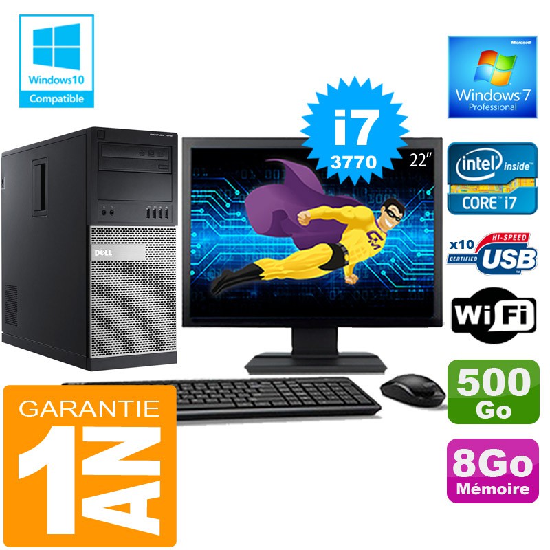 PC Tour DELL 7010 MT - Intel® Core I7-3770 3,4Ghz (8 Mo de cache) - 8Go DDR3 - Disque Dur 500 Go - Graveur DVD - Clé WIFI USB - Windows 7 Pro - Pack Clavier + Souris + Ecran 22" ( Marque et modèle selon arrivages) - Garantie = 1 an.