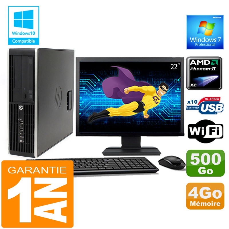 PC HP Compaq 6005 Pro SFF -AMD Phenom II X2 B57 3.2Ghz (6 Mo de cache) - 4 Go DDR3 - Disque Dur 500 Go - Graveur DVD - Clé WIFI USB - Windows 7 Pro - Pack Clavier + Souris + Ecran 22" ( Marque et modèle selon arrivages) - Garantie = 1 an.