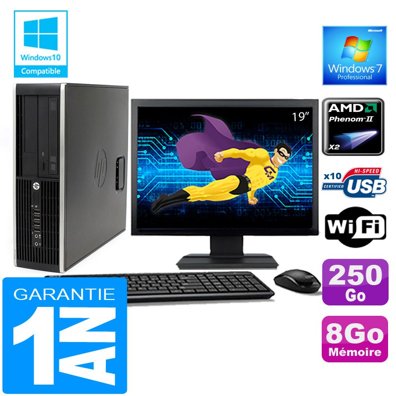 PC HP Compaq 6005 Pro SFF -AMD Phenom II X2 B57 3.2Ghz (6 Mo de cache) - 8 Go DDR3 - Disque Dur 250 Go - Graveur DVD - Clé WIFI USB - Windows 7 Pro - Pack Clavier + Souris + Ecran 19" ( Marque et modèle selon arrivages) - Garantie = 1 an.